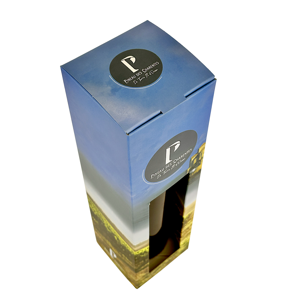Découvrez notre étui "PINEAU DES CHARENTES" décor "TERRE & OCEAN" en carton compact couché 550g/m2 avec fond automatique et cale goulot. Sa finition pelliculée anti rayures vous permettra de valoriser de manière élégante vos bouteilles de Pineau des Charentes.