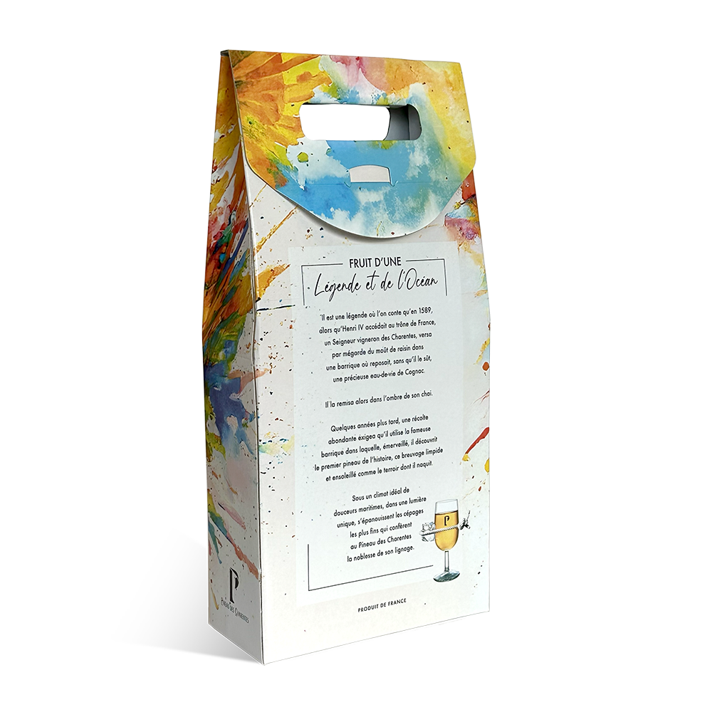 Découvrez notre valisette 2 bouteilles en carton micro cannelure avec fond automatique avec notre décor exclusif "ARTISTE" qui valorisera de manière élégante vos bouteilles de Pineau des Charentes.