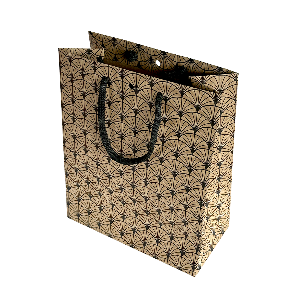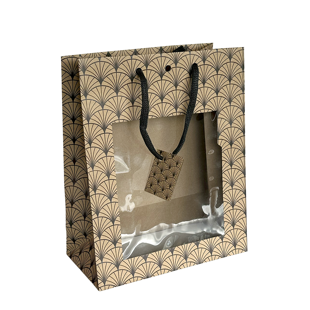 Découvrez notre Sac en kraft brun décor noir fenêtre avec poignées cordelières en coton vous permettra de sublimer vos produits d'exception. Ce sac élégant en papier de 175gr sera idéal pour pour vos carafes, vos bouteilles 20cl et également vos compositions ou encore tout autre contenance (conserverie, ballotin de chocolat etc...) ; fond renforcé.